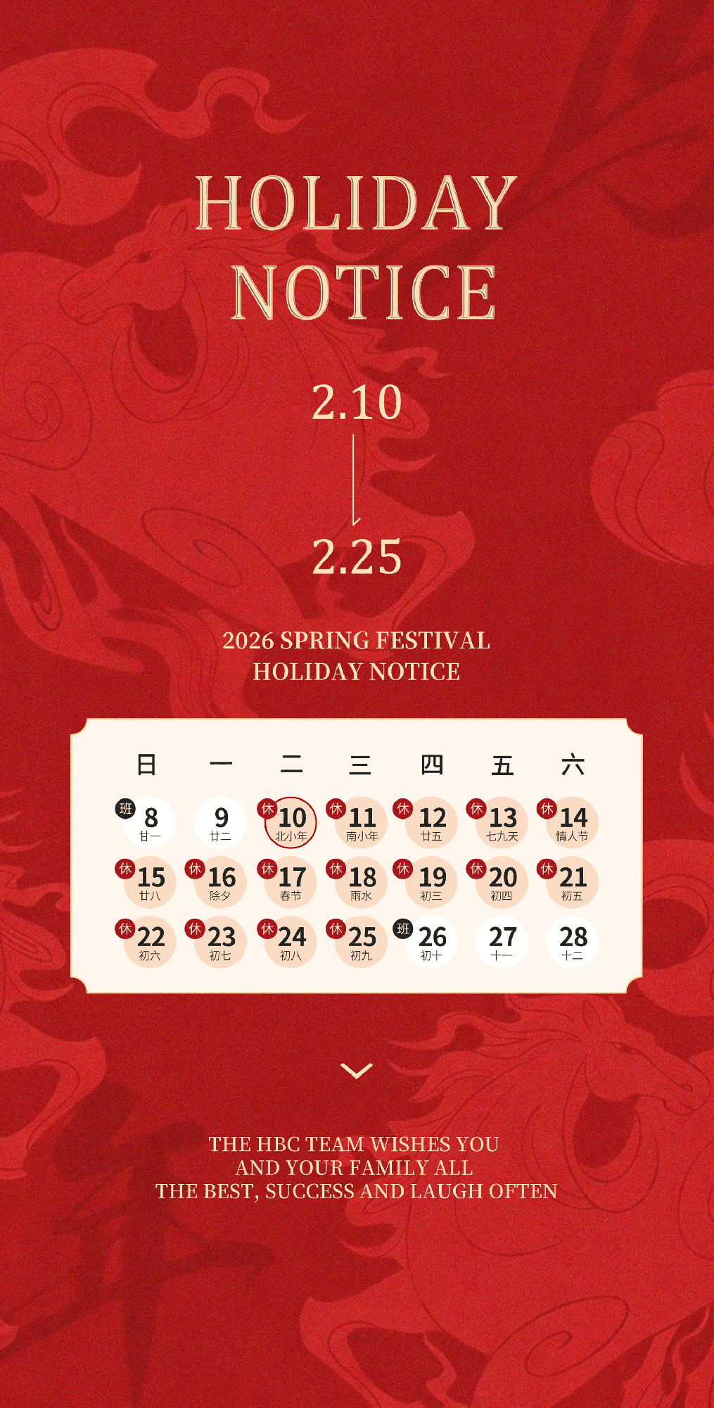 FebDear Clients and Partners:According to the national Spring Festival holiday schedule and considering the actual situation of our company, the holiday arrangemen···